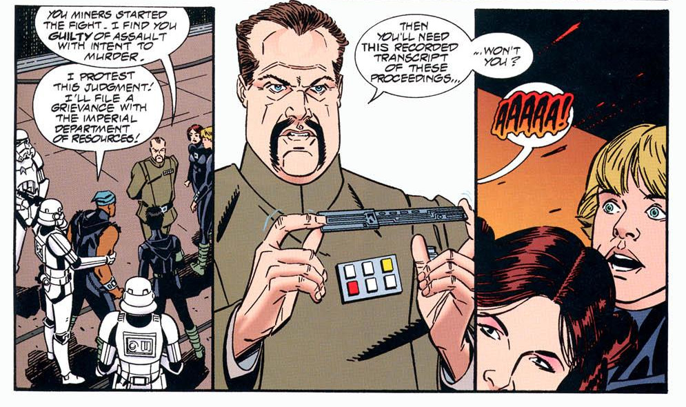 Before the quest gets underway, Luke and Leia get into a fight with local ruffians who, shockingly, attempt to rape Leia, grabbing her chest and ripping her clothes. It’s such a weird, dark turn for the story. Luke steps in however and uses his lightsaber, cutting off a hand and stabbing someone else through the leg. Curiously, the hand stump cauterises instantly unlike A New Hope. The Empire finally show up but the troopers and officers initially seem like anything but baddies. Introducing the main villains by having them be a competent police force, breaking up a homicidal fight and arresting would-be rapists is an odd statement. Maybe Foster could have highlighted the negative geological effects of the Imperial mining operation but considering how much Luke and Leia hate the planet and are dismissive of the natives, they’d probably cheer on a natural disaster. The two of them are also detained and Luke’s lightsaber is taken but no one thinks twice about it. It seems lightsabers are common enough weapons, not just the blade of a Jedi.