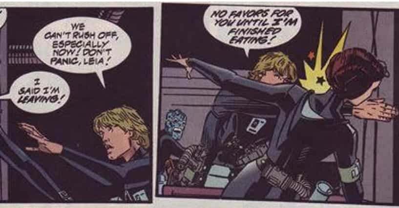 Likewise, Leia is not the “into the garbage chute, flyboy” character we know from the films. She’s more like Luke should be, uncertain of everything, inexperienced with life outside her sheltered existence, only for her it was a palace. I prefer her as the adventurous spirit who has been aiding the rebellion for years. Instead, she flips out, faints, and screams. She’s not politically minded and only began fighting the Empire because they created nothing entertaining and stifled original thought. I hate this. And the worst example is that Leia can’t swim but Luke, the kid who never left the desert, can.