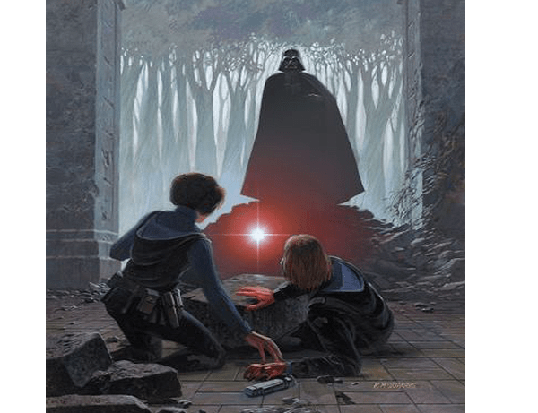 An odd week-long time jump later, Luke, Leia and Halla arrive at the Kaiburr crystal temple and once again face off with Vader. After a novel of disappointment, I love how Foster treats Leia here. She stands up to Vader, overcoming her fears after her torture at his hand in A New Hope, and grabs Luke’s saber to duel him. I would have liked to have seen something like this in the films. She even manages to cut Vader’s mask before he dominates her, leaving her face and body heavily scarred. Luke then fairs better but perhaps too much so. He actually bests Vader, cutting his arm off before he falls down a hole, the complete inverse of what happens in The Empire Strikes Back. I don’t like Vader being so easily beaten but it is a cool duel and more of an end to his and Luke’s conflict than Empire’s second act, although Luke does still collapse to the floor, dying.