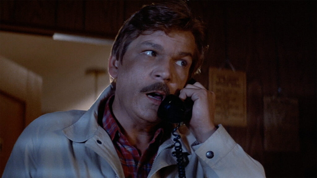 In the era of scream queens and final girls, Halloween III makes the odd choice to have a middle-aged man as its protagonist. Tom Atkins portrays Dan Challis, a divorced dad who is half Alan Partridge and half James Bond. He’s supposed to be some regular relatable everyman vying for his kids’ love but he’s also written as a screenwriter surrogate, a wish fulfilment of divorced dads everywhere. I’ve never bought Atkins as a romantic lead but John Carpenter clearly sees him as the most desirable man on the planet. In both this and The Fog he’s lusted over by every woman. Here he’s an alcoholic who’s banging teens and flirting/sexually harassing every woman in sight. Just like James Bond. Challis. Dan Challis.