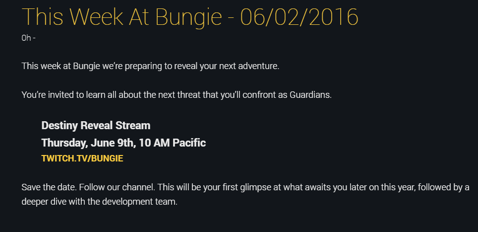 Bungie have revealed that they will be hosting an event on Thursday June 9th at 10am PT (5pm BST) to announce what is next for Destiny in the coming year.