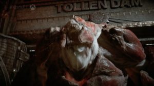 Kate and a couple of other Gears heroes had to fight off some Swarm enemies. You can take them out with “yank and shank” move, pulling an enemy over a ledge and then cutting its throat. The battle takes place in a giant wind storm, with sand blowing sideways, as the Gears fight.
