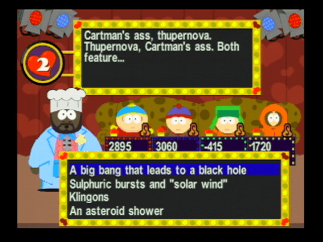 The game has you answering South Park Trivia questions in a game show styled setting. After each set of three questions, you play a randomly selected mini-game. Players score points by correctly answering questions and doing well in the mini-game rankings. The game was designed to be exclusively multiplayer; when played by only one player there is no computer-controlled character, so that player always wins, even with a negative score. The Mini-games themselves were often riffs on arcade classics reskinned to fit the South Park theme of crude jokes. For example, one mini-game is an asteroid clone only instead of asteroids, its butts. Big Floating Butts. Another is basically Donkey Kong but you’re a cat trying to get to the top to steal Cartman’s cheesy puffs.