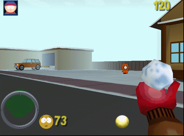 South Park took on the first-person shooter genre, putting players in control of either Cartman, Kyle, Stan or Kenny. The gameplay revolved around the player defeating various south park themed enemies across a level in order unlock the exit to the next level. The enemies featured had the distinct South Park feel such as rabid mutant turkeys, deformed clones of the townsfolk, alien visitors, berserk robots, and sentient killer toys. In addition to completing levels, the player must also prevent large enemies in the stage from reaching the exit before they do.