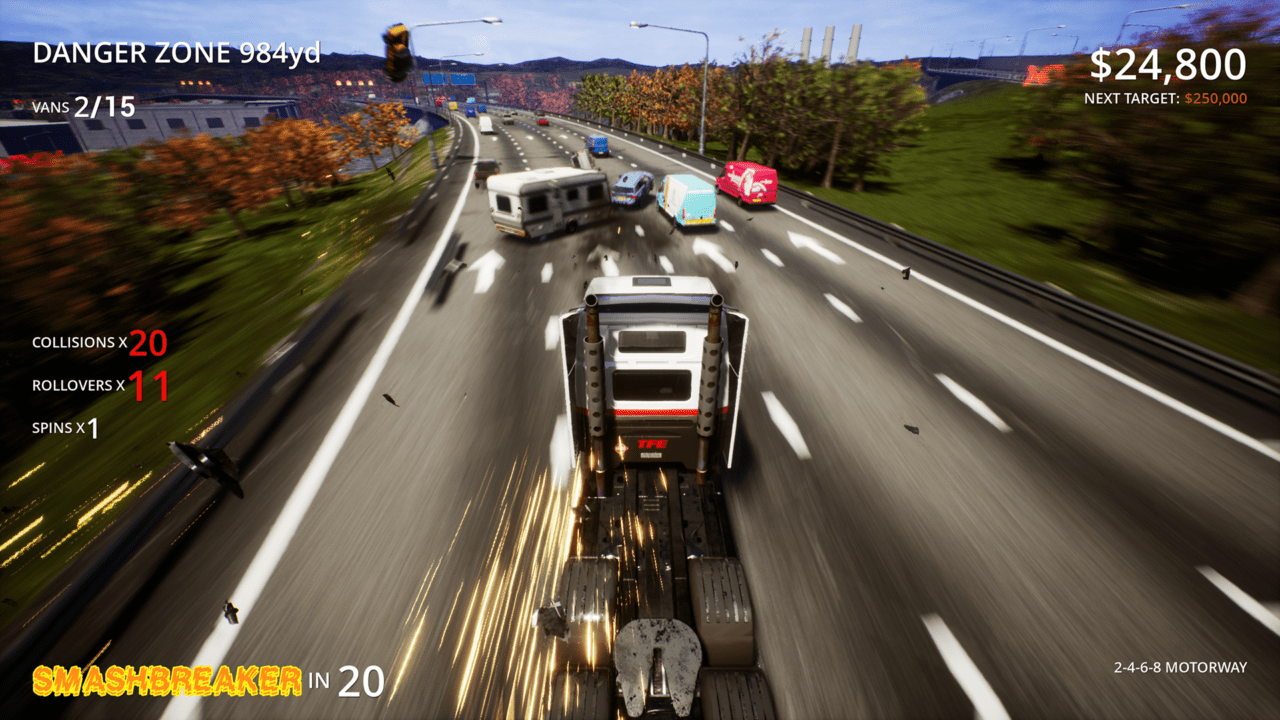 A big change this time is the inclusion of the run up. A stretch of road leading to the Danger Zone on which you’ll have an objective. This could be crash 15 cars, which you’ll have to hit from behind and direct into oncoming traffic, or chain a speed boost, some of the faster cars have a boost. Whilst these do repeat across the game they’re played out over different tracks with varying levels of traffic to engage with or miss entirely. Achieving the objective will give another bonus adding into the final score. This change may be the reason the initial pass through of a course, found in 2017s Danger Zone has been excluded. This initial look allowed a quick sense of planning before driving. The run up now feels like a second puzzle, something to solve to boost the score and to give the best approach to the Danger Zone. This makes it harder to one shot a perfect run but allows for exploration and experimentation to achieve your best possible run.