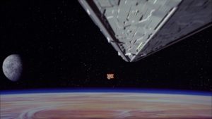 When trying to look on it with fresh eyes, the opening shot of Return of the Jedi is quite surprising. Within the first second of the film we pan down to reveal the second Death Star above the forest moon of Endor. This pivotal element is revealed straight away with a quick shot rather than with a dramatic build-up, something The Rise of Skywalker copied with Palpatine’s return. Thinking on it, I do like the idea of simply showing you the station straight away with little flair. A Star Destroyer then passes overhead in a clear homage to the first film; they’re framed almost identically. Star Wars has always been paying homage and copying itself, which is something some people who complain about the sequels seem to forget. A new Lambda class shuttle soon departs the larger ship and heads for the station flanked by TIE Fighters. The shuttle is a very cool design and the sound effect of its wings opening has always stayed with me. At one point, you can’t tell what’s the score and what’s sound design. Overall, it’s a strong opening and I love the way evil dominates the screen, which will make the rebel victory at the film’s end all the more satisfying.