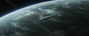 Pan down. A ball of ice hovers amid a field of stars, half in shadow. A triangular ship crosses over the planet, different yet familiar, and the absence of light caused by its appearance allows it only to be seen in silhouette. From this visual storytelling we understand. The occupants of this ship wish to remain hidden and this Star Destroyer is not dominating the screen like they used to. The First Order is working from the shadows. Even from this one shot you realise they are not in control of the galaxy like their Imperial forefathers. Just as the Destroyer is about to eclipse the light of the planet entirely, we see some small transports exit its hanger, again in shadow, almost getting lost in the darkness of space before suddenly flying past the camera, creating a sense of urgency as the music builds.