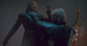 Those who do ultimately perish are obvious from the outset, with Ed dying first. He dies in the first onslaught after saving Sam, a noble death but foreseeable. Next is Lyanna, who became a recurring character due to her popularity with fans and not because she’s in any way important, and she gets a fun death; the smallest warrior killing an undead giant with her last breath. Then Beric falls saving Arya. It’s a death he himself has been predicting for quite some time and it feels right. The follower of the Lord of Light saving the ‘Prince(ess) That Was Promised’ from the Night King’s forces. He even unsubtly dies performing a Christ pose to block the undead.