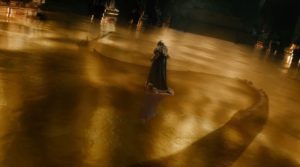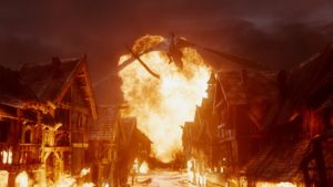 While this directional choice does give us multiple cool shots of the massacre, it sacrifices character drama and emotion. We don’t really care for the people of Lake-town who are being decimated with every blast of dragon-fire. The only reason to keep some of the Dwarves in Lake-town while the rest of the company travelled to the Lonely Mountain is to put some characters we know in peril, but they don’t do anything during the attack but slowly float away on a boat. Bard is the primary point of view character and his feeble defense of the town soon gets the attention of Smaug. The two face off and the sequence gets much more interesting when it narrows the focus to this personal battle, and finally, with the arrival of Bard’s son carrying the Black Arrow, we get some emotional stakes. While it’s a little contrived and over the top, I do like the moment of Bard using his son’s shoulder to rest the arrow on as he takes the fateful shot; a miss meaning certain death for both of them but a hit ensuring their survival, as well as saving the remaining residents of Lake-town.