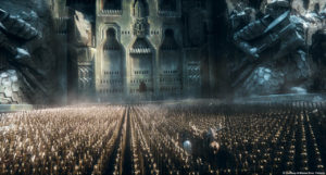 Two Orc armies also march for the mountain for a very different reason. In the previous film we learned that Sauron wanted Smaug, not Erebor, but now his forces wish to capture the kingdom despite the dragon’s death. Gandalf says that if they are successful then the entirety of Middle Earth will fall because of Erebor’s tactical position, which is a huge statement that comes out of nowhere. Suddenly the stakes are Lord of the Rings-level big when they just don’t need to be. The story taking such a drastic apocalyptic turn, first by fire and then by war, isn’t necessary and it’s clear that Jackson is trying to make another Lord of the Rings film rather than sticking to the smaller tale of The Hobbit, creating a major identity crisis and a poor mix of tones.