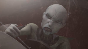 Turned invisible by magick and joined by two Nightsisters, Ventress launches an assassination attempt on Dooku in his home on Serenno. Despite being drugged and fighting opponents he can barely see, Tyranus successfully fends off his attackers and bests them. A benefit of a villain vs villain duel is that whoever the winner is is usually the person who loses in the show’s lightsaber fights. The Jedi, our flawed but noble heroes, often have to win so it’s great seeing Dooku actually be a force to be reckoned with instead of run away or lose his head/hands at the end. Ventress may have lost this round but she and Talzin decide to enact a new, more monstrous plan.