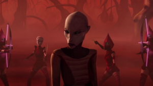 Nightsisters is Asajj Ventress’s episode. It begins and ends with her, the more well-known characters relegated to mere supporting roles in her narrative. It’s at this point the series and its creators are confident enough to look past the key cast of movie characters and instead develop a show-specific villain. Asajj may appear in the animated movie that kicked off the show, and multiple episodes in the earlier seasons, but this is truly the start of her arc. The episode she becomes an actual character rather than just an adversary for our heroes to face and flirt with when the writers decide they’ve used Dooku or Grievous too much recently, although the seasons building up her villainy ultimately prove necessary.