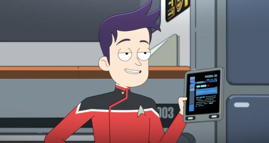 Being lowly lower deck officers, the show’s main characters look up to past Star Trek heroes, obsessing over their escapades, essentially making them in-universe Star Trek fans. It’s a clever way of naturally weaving in references to past stories yet it can be taken too far. Sometimes it feels too real world a discussion or reference, breaking the fourth wall, with the characters commenting like they’ve seen actual episodes rather than just reading the reports. Xon, a deep cut character from the unproduced Phase II TV show is mentioned yet there’s no reason why anyone would know who this non-existent character is. And then the most damning example is Boimler humming the Motion Picture/TNG theme to himself in the third episode. That’s purely an out-of-universe gag which makes no sense inside canon.