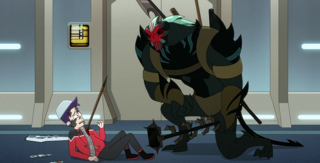 I love Fred Tatasciore. He’s one of the most prominent voice actors working today, and one of the best. But I think he’s too prominent in Lower Decks. This is an issue with the casting rather than the actor. He’s wonderful as Shaxs but too often he’s called upon to voice the alien-of-the-week. Or aliens-of-the-weeks. It becomes very noticeable this season, with every other character being voiced by Tatasciore. Whether it’s a member of an alien delegation, a space deity, a volcano with a consciousness, or all three in one, it’ll be Fred’s voice. I don’t know what the budget for guest stars is but this season needed a wider pool of talent.