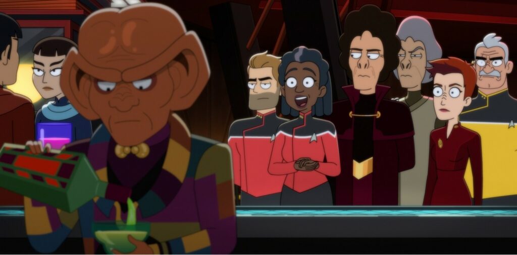 Hear All, Trust Nothing is a prime example of the show’s ability to balance reverence for Star Trek’s past with its own forward-looking storytelling. I love Deep Space Nine. It’s the my favourite Star Trek show and honestly probably the franchise’s peak. This episode is a wonderful revisit to that world, or, rather, space station. The location itself and the characters within are well realised in animation, translated well, with darker visuals and Quark and Kira being well written. Morn in particular has perfect dialogue. The temptation is there for a DS9 revival, a legacy show picking up the story, but honestly this is probably the best we can hope for. An episode of an animated comedy may not seem like the best epilogue but I think it’s the best option to avoid disappointment.
