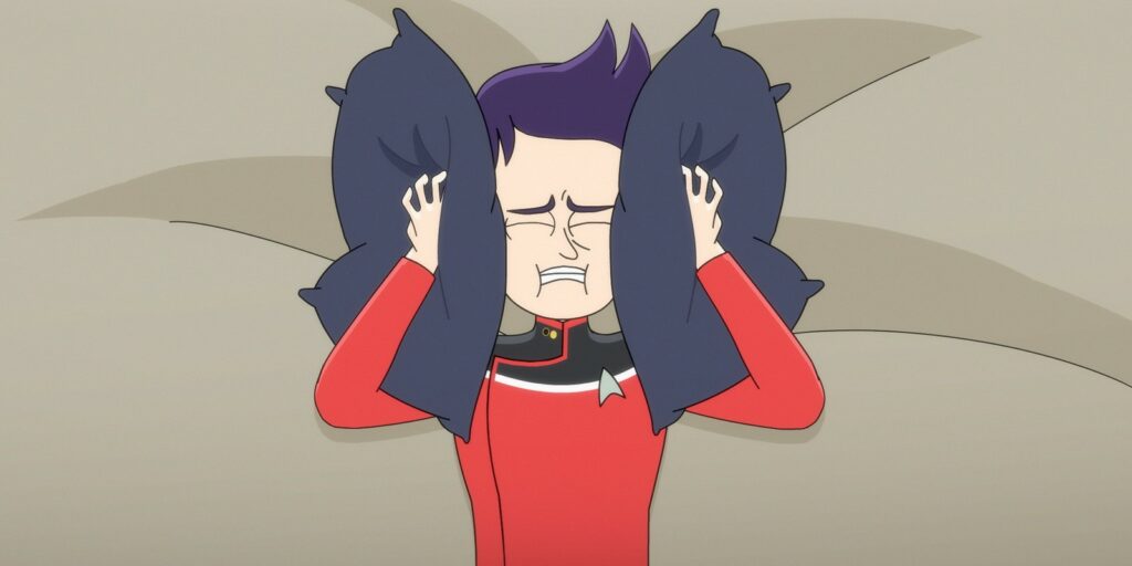 After the Star Trek-specific jokes began to run dry, season 3 started to fall back on some old sitcom tropey storylines and it didn’t really work. ‘Bold Boimler’ is probably still the nadir of the show. The fourth season still relies on some cliché comedy stories but it does a much better job of at least wrapping them in a Star Trek veneer to make them more successful. I think one of them works wonderfully. Promotion achieved, Boimler gets to move out of the bunk corridor and into his own quarters, and the season’s second episode features a running joke of him finding issues with his choices. His first pick is opposite the nacelle bussard light, shining brightly through his window like the chicken roaster sign in Kramer’s place in that memorable Seinfeld episode. Then he moves to a room between holodecks, which have thin walls, meaning he can hear the sexy Robin Hood roleplay with clarity. It’s not a new joke but it is successfully transferred into Star Trek, using franchise specific elements, adapted for the franchise, which is an improvement over the previous season’s purely generic faire.