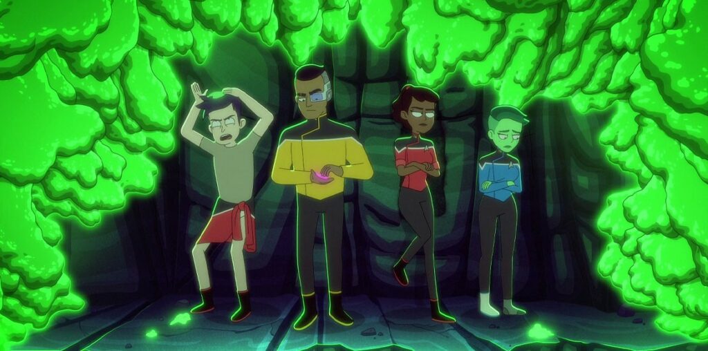 Just when you thought Lower Decks had run out of Star Trek tropes to lambast, along comes Caves. As with the best references in the show, it’s a knowing, loving episode poking fun at the repeated use of the same cave set from TNG through to Enterprise, known as ‘Planet Hell’. Every cave on every planet looks the same, with the same outcroppings and the same unrealistically smooth floor. The episode is a bottle show, taking place almost entirely within the cave, with each of the four main cast reminiscing about other adventures they’ve got up to in identical caves. I found it to be the funniest episode of the season but also the cleverest, too. While at first the memories seem to make the episode nothing but a series of sketches, they come together and inform the main action in interesting ways, unlocking the wider narrative and characterisation.