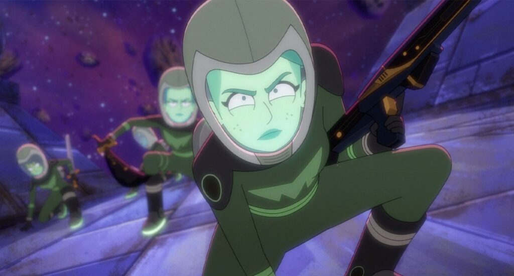 This may sound strange but honestly the moment I found funniest this season might not have even been an intentional joke. It’s a moment that cleverly subverts our expectations after five seasons of this series, and it happens in the season’s opening scene. A haughty alien collector, one of many featured in Lower Decks, shows a young very-much-not-green woman around his collection who is clearly voiced by Tendi’s voice actor Noël Wells. This happens so often in this series; regular cast members brought in to voice a handful of other minor characters across a season. It saves money but it’s not a practice I like because they are so clearly the same actor, with every character voiced by Jack Quaid, who I like a lot, sounding exactly like Boimler. I wrote about the show’s overreliance on Fred Tatasciore as the voice of every alien back in my season 3 article. So it was a joyous moment when Dos Cerritos, whether intentionally or unintentionally, used this fact to trick the audience: it turns out the character voiced by Wells is in fact Tendi in disguise, and the joke was on me for presuming they’d just brought her in voice a separate character. An extra clever little meta twist for attentive fans of the show.
